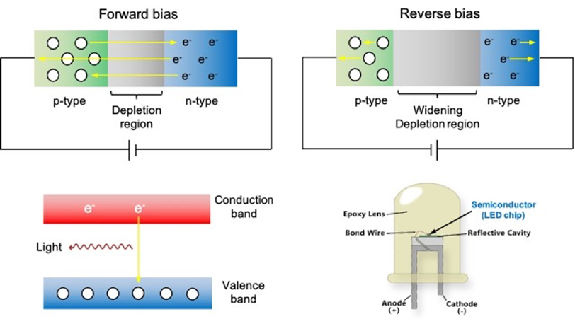 When a voltage is applied across the p-n junction, with the positive terminal connected to the p-type material and the negative terminal connected to the n-type material, forward bias occurs (see diagram below). In this state, electrons from the n-type material gain energy and cross the junction into the p-type material. The majority recombine with holes, while a small fraction continues to drift through the p-type material and into the external circuit, contributing to the current flowing through the device.