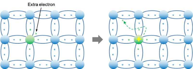 Conversely, when phosphorus (P), a pentavalent element, is introduced, it forms four covalent bonds with neighbouring silicon atoms using four of its valence electrons. The fifth electron, however, is not involved in bonding and remains loosely bound to the P atom. This electron can be easily excited to the conduction band with a small amount of thermal energy, allowing it to move freely through the lattice and leaving the ionised donor P atom positively charged. As a result, the addition of P creates an n-type semiconductor (see diagram below), where free electrons contribute to electrical conductivity.