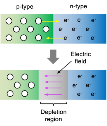 The magic happens when a p-type semiconductor is connected to an n-type semiconductor, creating a p-n junction (see diagram below). Free electrons (negative charge carriers) from the n-type side begin to diffuse into the p-type side, where they recombine with holes. This recombination reduces the number of free carriers on the p-type side near the junction, leaving behind positively charged donor ions on the n-type side. Similarly, holes (positive charge carriers) from the p-type side diffuse into the n-type side and recombine with free electrons, leaving behind negatively charged acceptor ions in the p-type side. This process establishes an electric field across the junction that opposes further diffusion of carriers. Eventually, a state of equilibrium is reached where the diffusion of electrons and holes is balanced by the electric field, generating a depletion region — an electrically neutral region devoid of any mobile charge carriers. This equilibrium can be easily disrupted when electrons from the n-type side gain additional energy from an external source.