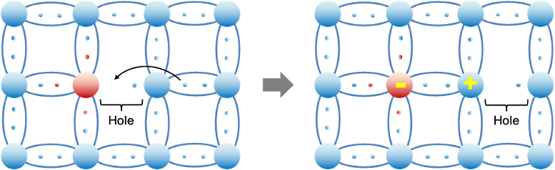 Silicon (Si) and gallium arsenide (GaAs) are common base materials in the manufacture of semiconductors. Si has a diamond cubic crystal structure, where each Si atom, which has four valence electrons, is covalently bonded to four neighbouring Si atoms, forming a tetrahedral arrangement. When boron (B), a trivalent element, is added, it replaces a Si atom in the lattice. Since B has only three valence electrons, it forms three covalent bonds with neighbouring Si atoms, leaving one bond unfulfilled. This unfulfilled bond, which lacks an electron, is known as a “hole”. With sufficient energy, such as in the presence of an electric field, an electron from a neighboring Si atom can move into the hole, forming a covalent bond with the B atom (the acceptor atom) and leaving a new hole in its original position. The ionised B atom becomes negatively charged, while the ionised Si atom is positively charged. As this process repeats, the hole (or the positively charged atom) appears to move through the lattice in the opposite direction to the movement of the electrons. This type of doped material is called a p-type semiconductor (see diagram below).