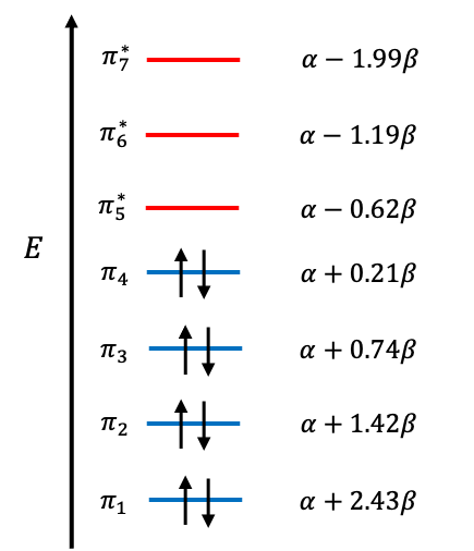 Solving the above six simultaneous equations, along with the normalisation equation, using algebra for the HOMO coefficients and Excel Solver for the remaining coefficients, give: