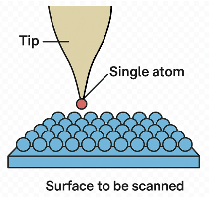 The STM tip must be atomically sharp, ideally terminating in a single atom, because the tunnelling current is dominated by the atom closest to the sample. It is usually made of tungsten, platinum–iridium, or another conductive material. Tips are often prepared by electrochemical etching, which produces a fine point, followed by gentle cleaning to remove contaminants.