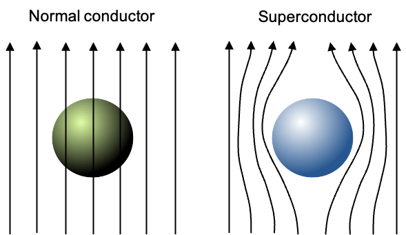 In a normal conductor, magnetic fields penetrate the material almost uniformly (see diagram above), limited only by weak and short-lived effects such as induced eddy currents. If the external magnetic field changes with time, Faraday’s law generates eddy currents in the conductor, but these currents quickly decay because the material has finite electrical resistance. As they die out, they no longer oppose the applied field, allowing the magnetic field to fully penetrate the bulk.