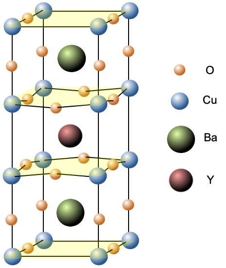YBa2Cu3Ox has a layered, perovskite-like crystal structure, with alternating layers of CuO₂ planes and other layers containing yttrium and barium (see above diagram for the unit cell of YBa2Cu3O7). The CuO₂ planes are where superconductivity primarily occurs, while the other layers act as charge reservoirs and provide structural support for the lattice. This arrangement creates an energetically favourable environment in which the electronic properties necessary for superconductivity can emerge.