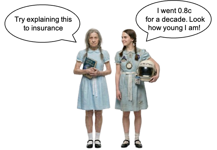 From Jane’s point of view, she is stationary and Jill is moving. A direct application of time dilation might suggest the opposite result, that Jill ages less, leading to an apparent paradox. However, due to length contraction, the distance to the star is no longer 10 light-years in Jane’s frame; it is reduced to light-years, with the round trip taking